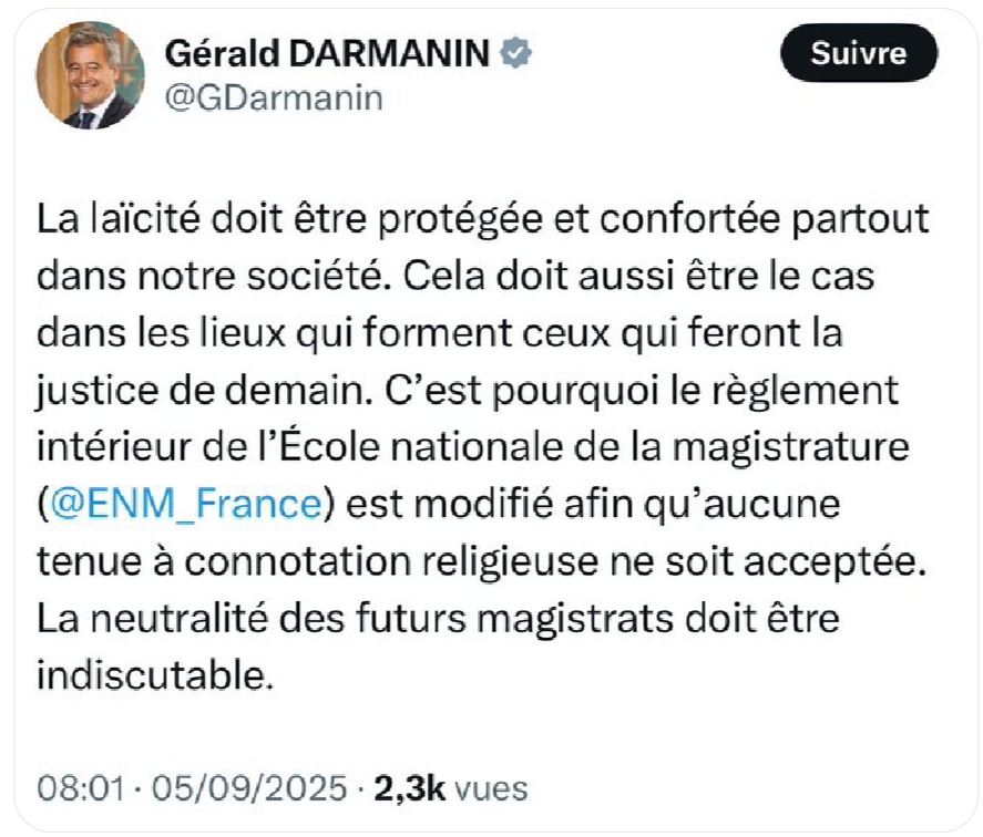 Le ministre de la Justice, Gérald Darmanin, a annoncé un durcissement du règlement intérieur de l’École nationale de la magistrature (ENM). Dans un message publié sur X ce vendredi 5 septembre, il a affirmé : « La laïcité doit être protégée et consolidée dans tous les espaces de notre société. Cela vaut aussi pour les lieux où l’on prépare celles et ceux qui rendront la justice demain. »
